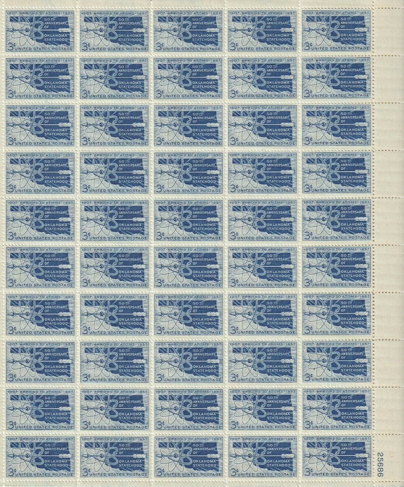 Oklahoma Statehood Sheet of Fifty 3 Cent Postage Stamps Scott 1092