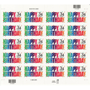 Happy Birthday Sheet of Twenty 34 Cent Stamps Scott 3558