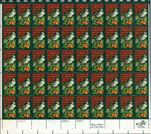 Partridge in a Pear Tree Sheet of Fifty 8 Cent Postage Stamps Scott 1445