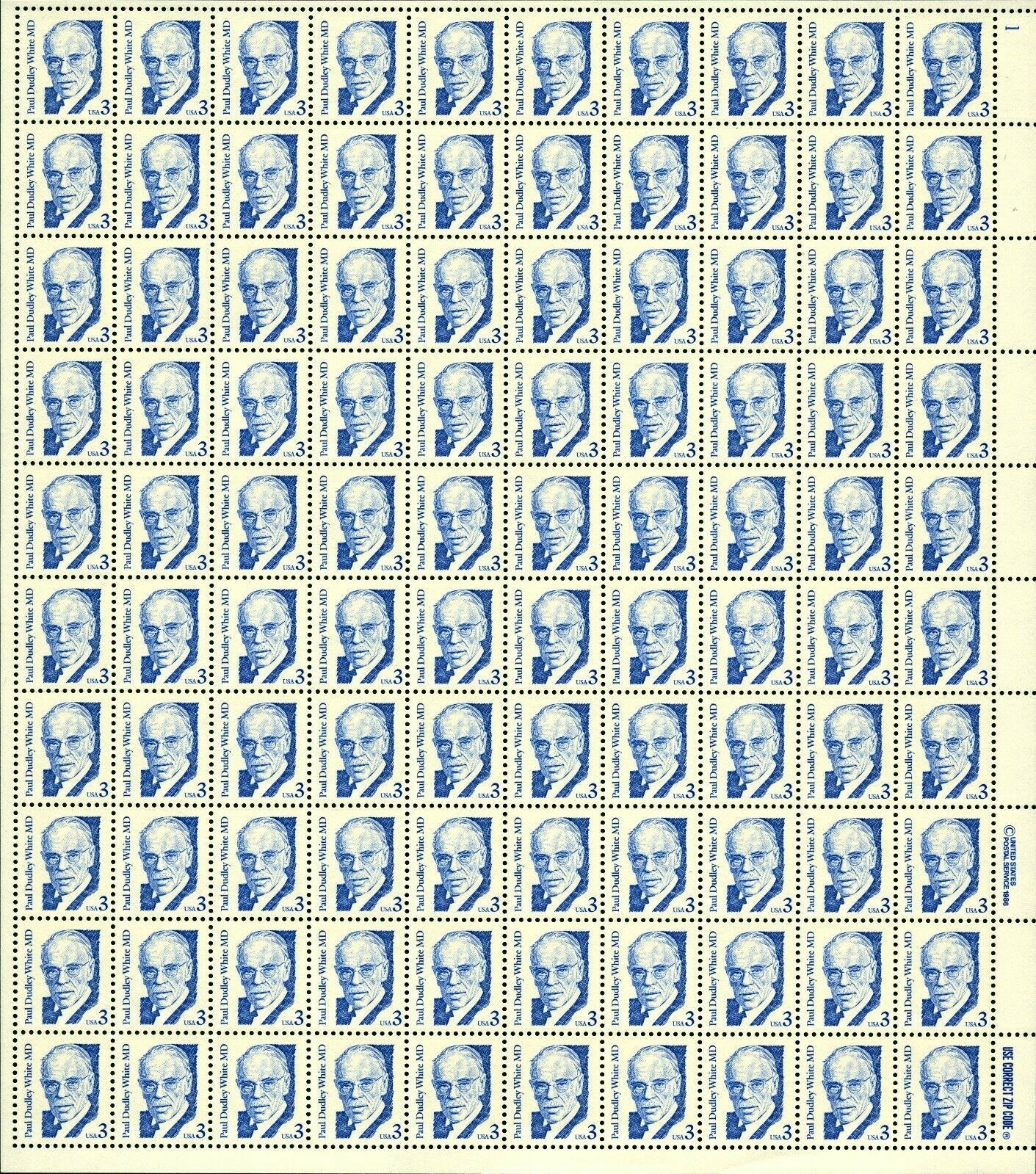 Paul Dudley White MD Sheet of 100 - 3 Cent Postage Stamps Scott 2170