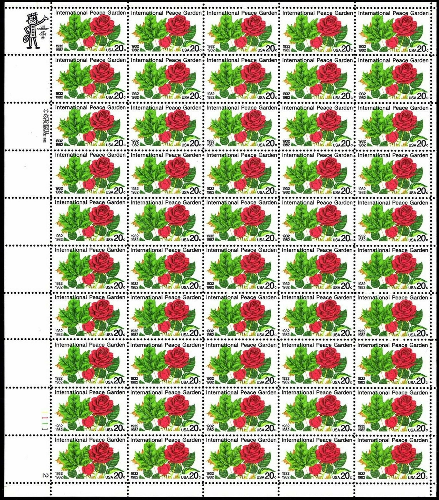 Peace Garden Sheet of Fifty 20 Cent Postage Stamps Scott 2014