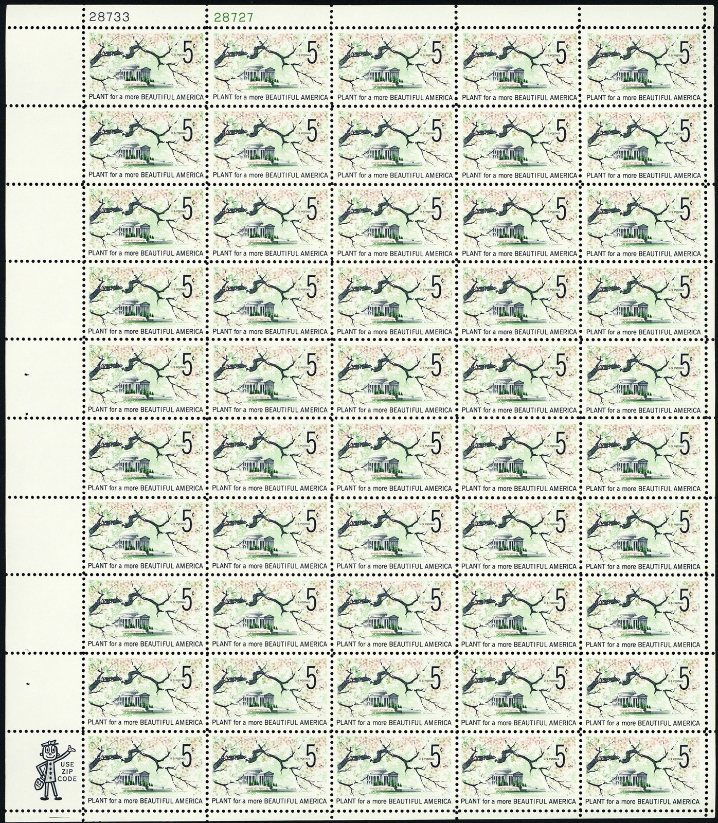 Plant for More Beautiful America Sheet of Fifty 5 Cent Postage Stamps Scott 1318
