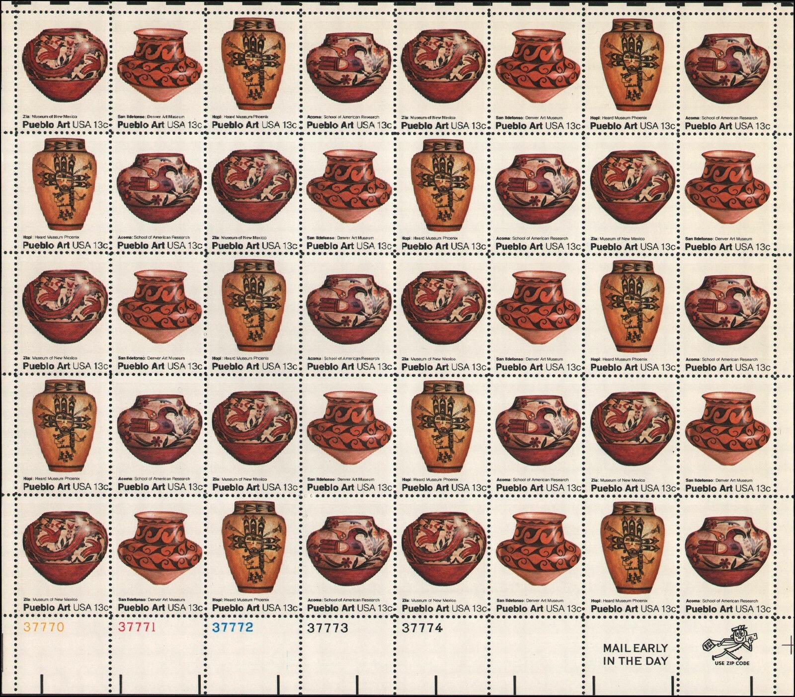 Pueblo Art Sheet of Forty 15 Cent Postage Stamps Scott 1706-09