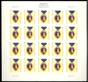 Purple Heart Medal Sheet of 20 - Current Rate Postage Stamps Scott 4529
