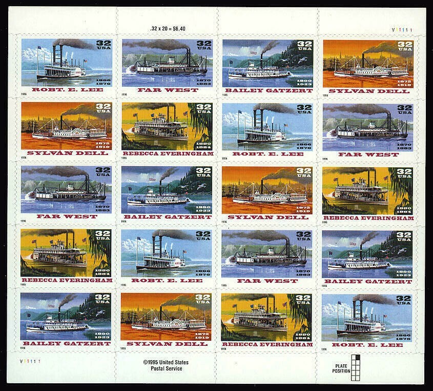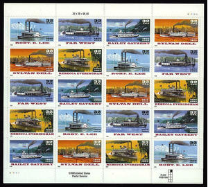 River Boats Sheet of Twenty 32 Cent Self Stick Postage Stamps Scott 3095a
