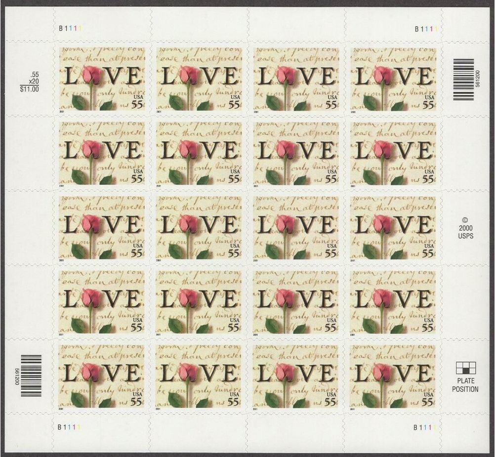 Rose and Love Letter Sheet of 20 Stamps - 55 Cent Postage Stamps Scott 3499