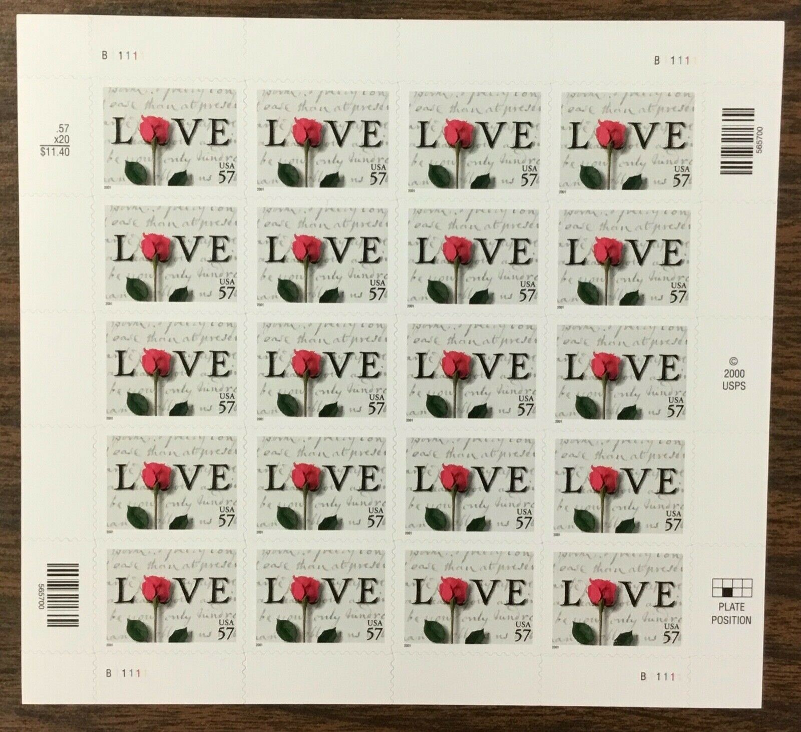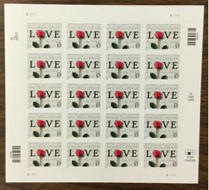 Rose and Love Letter Sheet of 20 Stamps - 57 Cent Postage Stamps Scott 3551