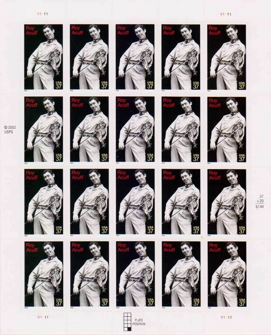 Roy Acuff Sheet of Twenty 37 Cent Postage Stamps Scott 3812