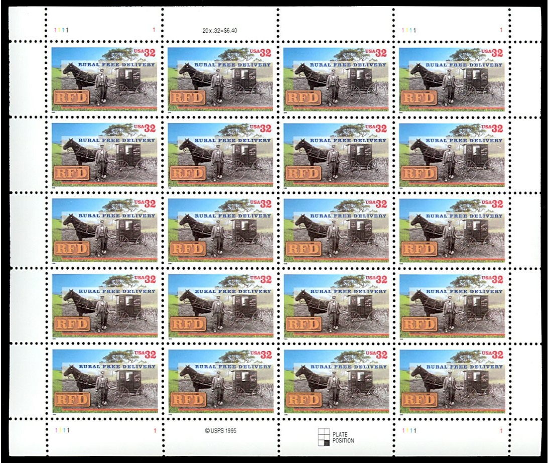 Rural Free Delivery Sheet of Twenty 32 Cent Postage Stamp Scott 3090