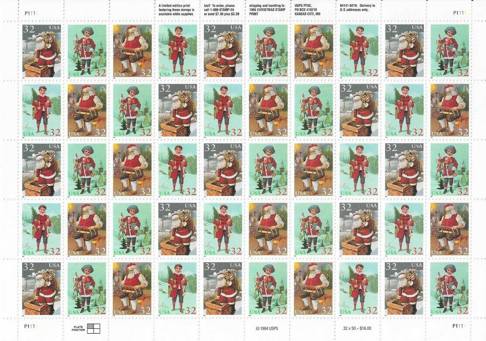Santa and Children Sheet of Fifty 32 Cent Postage Stamps Scott 3004-07
