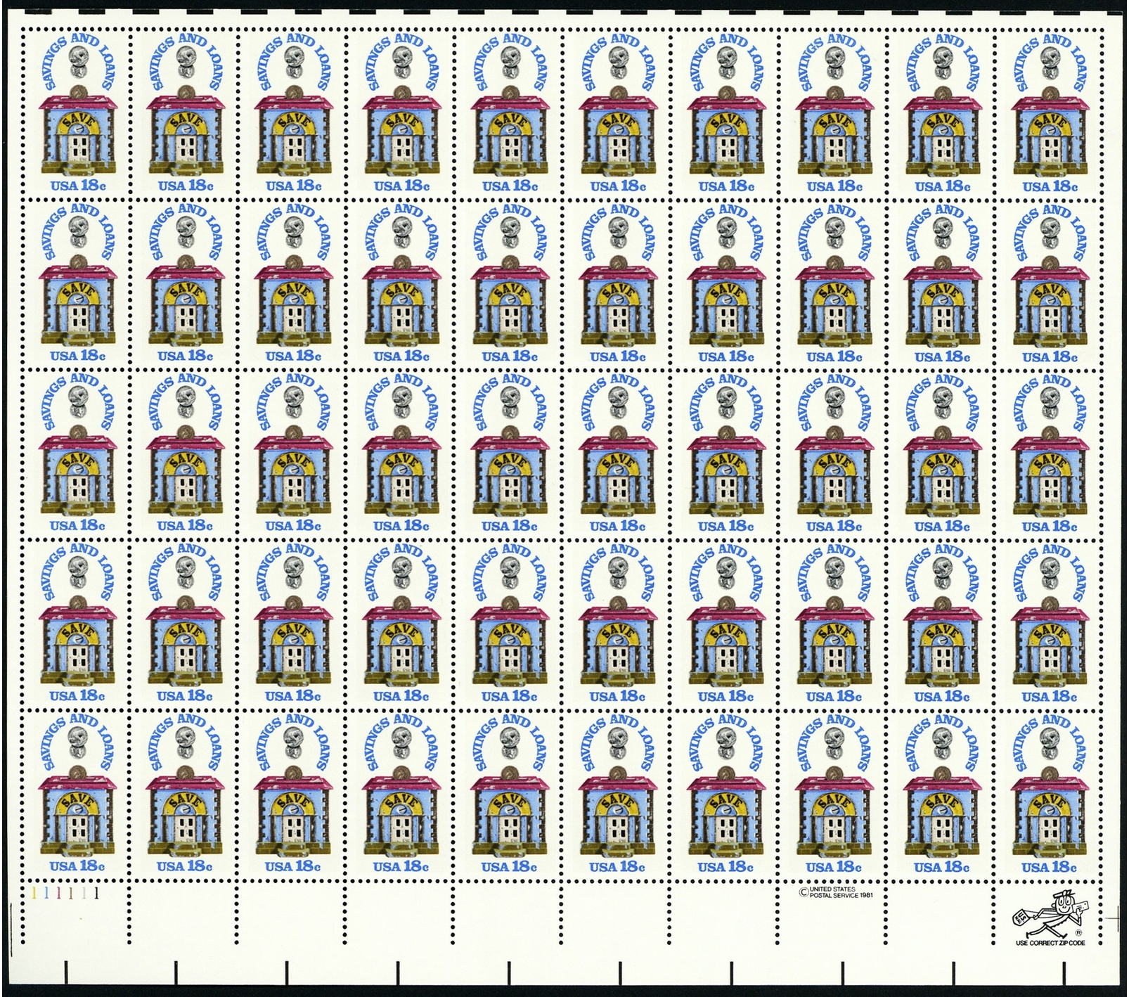 Savings & Loan Sheet of Fifty 18 Cent Postage Stamps Scott 1911