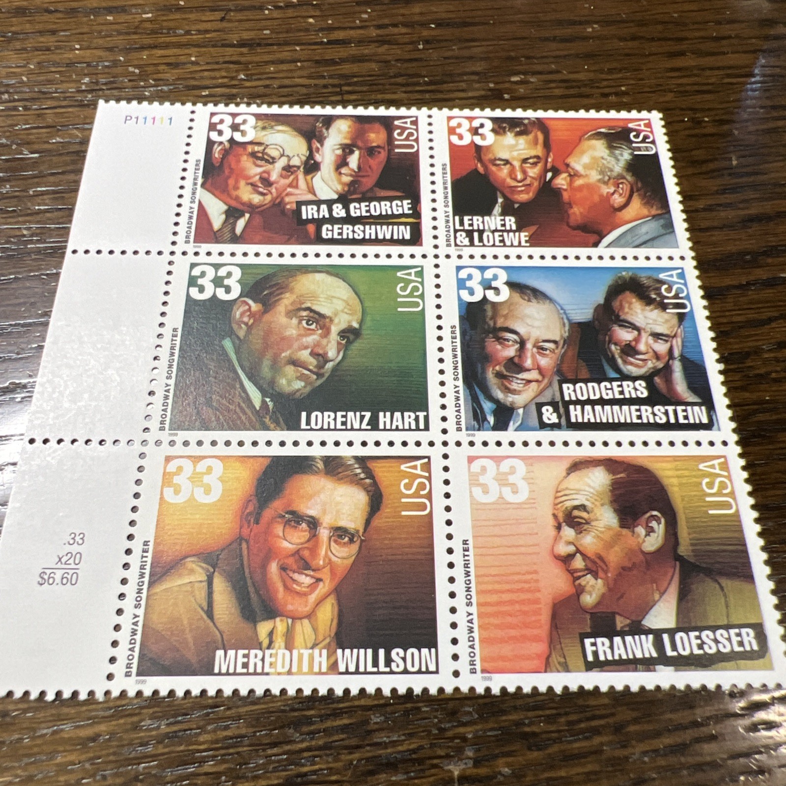 The product is a plate block of 6 stamps featuring Broadway songwriters, issued in 1999 by the United States Postal Service. These 33 cent stamps are part of the Legends of American Music series and are in mint condition with original gum. The multi-color stamps are certified by USPS and have a face value of $6.60. This collectible item showcases the rich history and cultural significance of American music through the eyes of renowned songwriters.