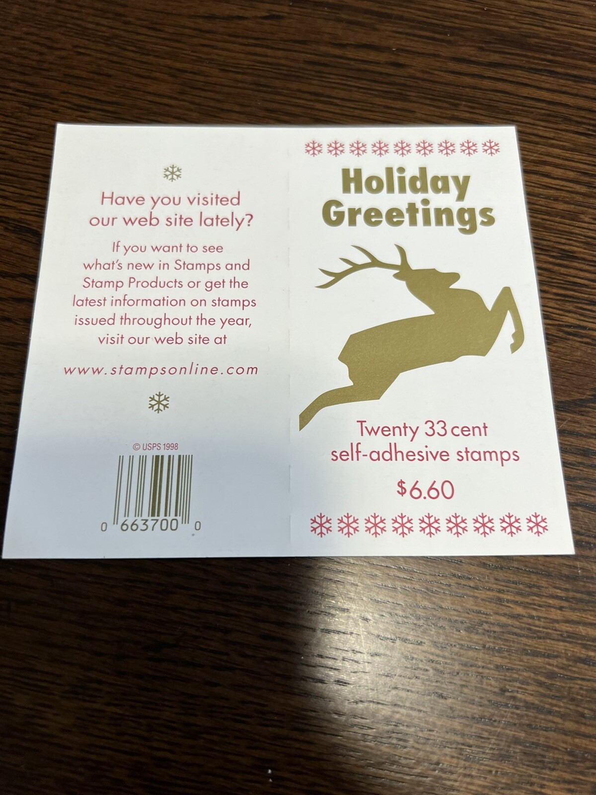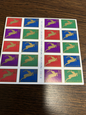 Scott #3360-63 a Christmas Reindeer 1999 Booklet of 20 MNH 33 Cent Stamps.