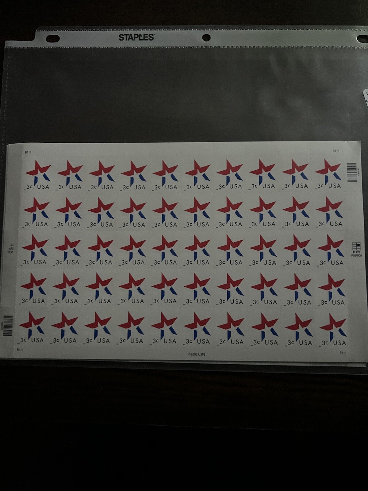 SCOTT #3613 3c S/A Pane of 50 MNH Red White and Blue Star Stamps(2001).