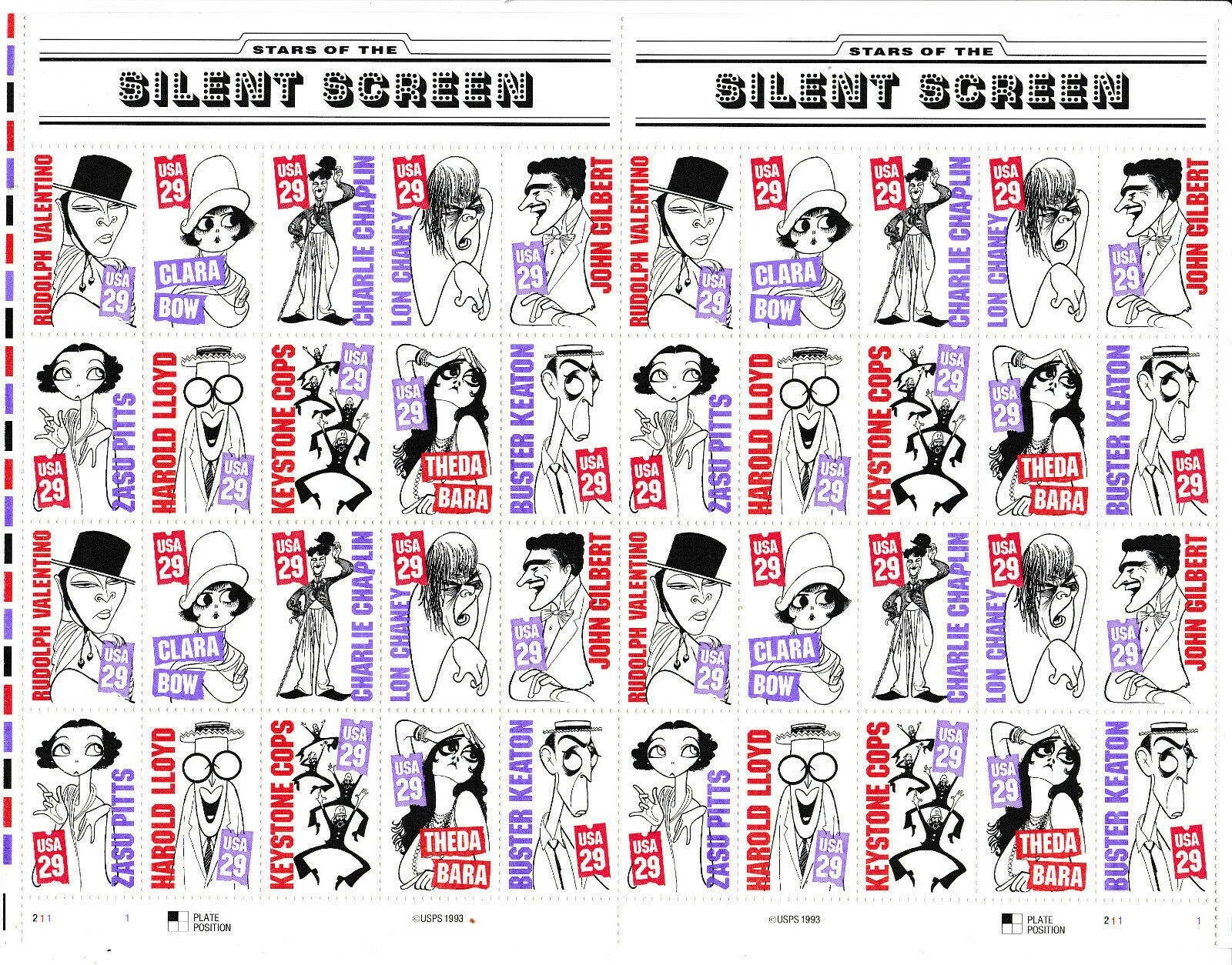 Silent Screen Stars Sheet of Forty 29 Cent Postage Stamps Scott 2819-28