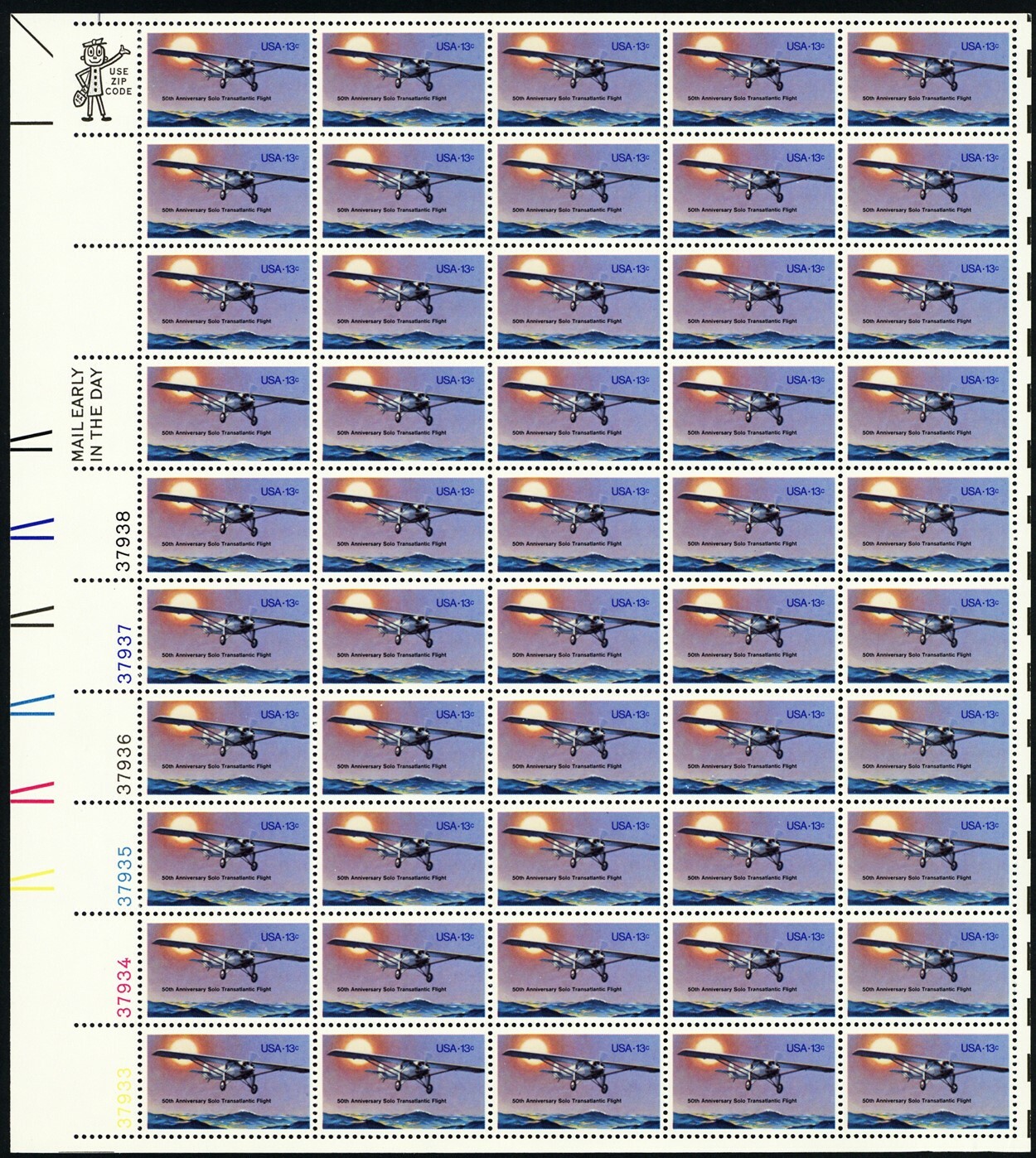 Spirit of St. Louis Airplane Lindbergh Sheet of Fifty 13 Cent Stamps Scott 1710