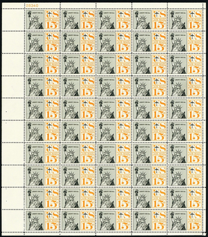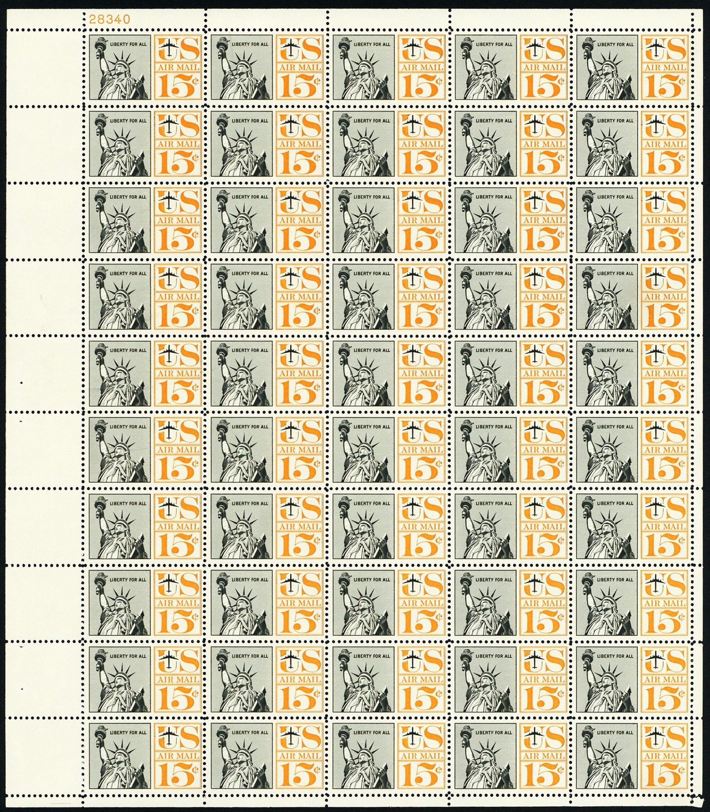 Statue of Liberty Full Sheet of Fifty 15 Cent Airmail Postage Stamps Scott C63