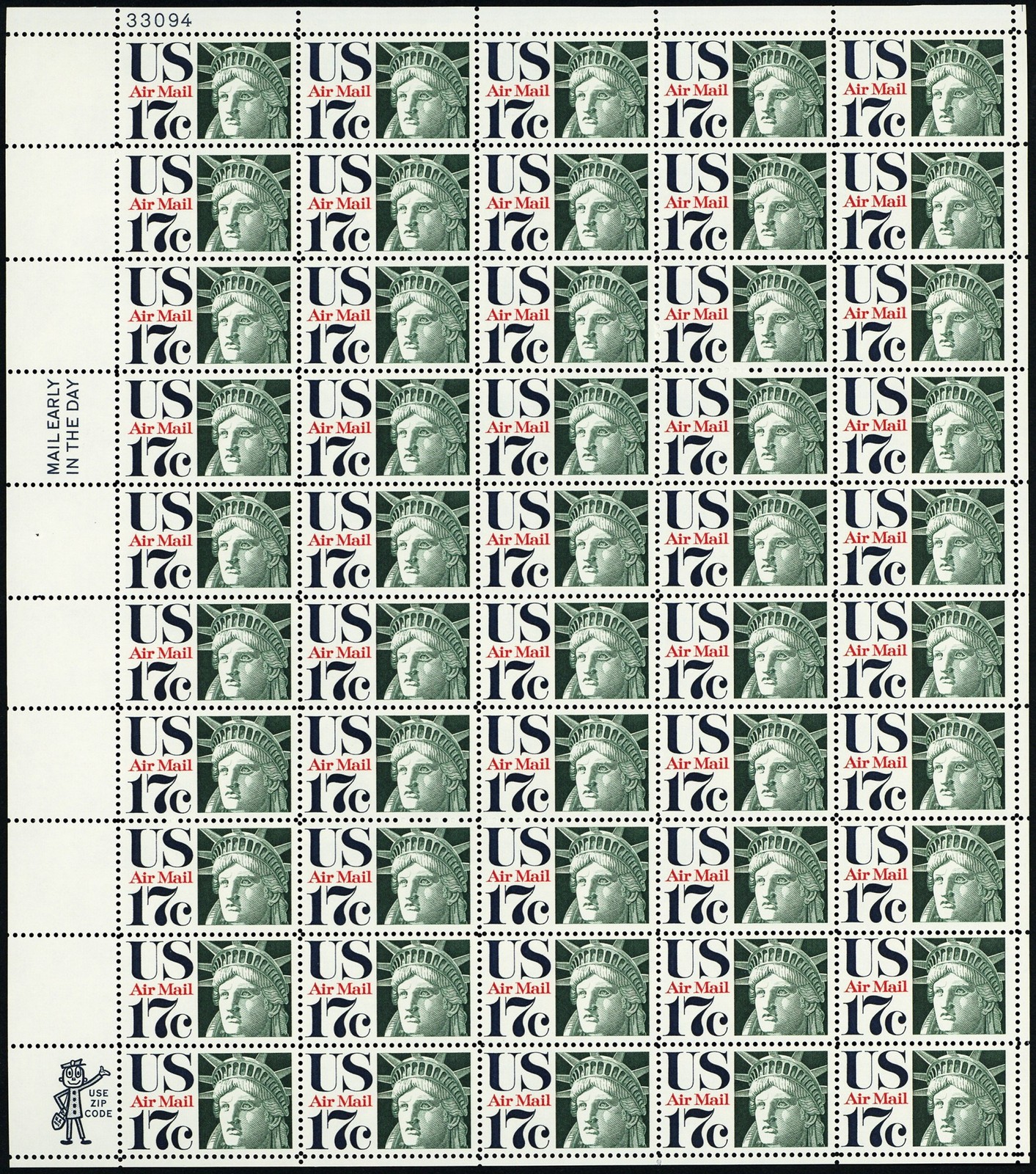 Statue of Liberty Full Sheet of Fifty 17 Cent Airmail Postage Stamps Scott C80