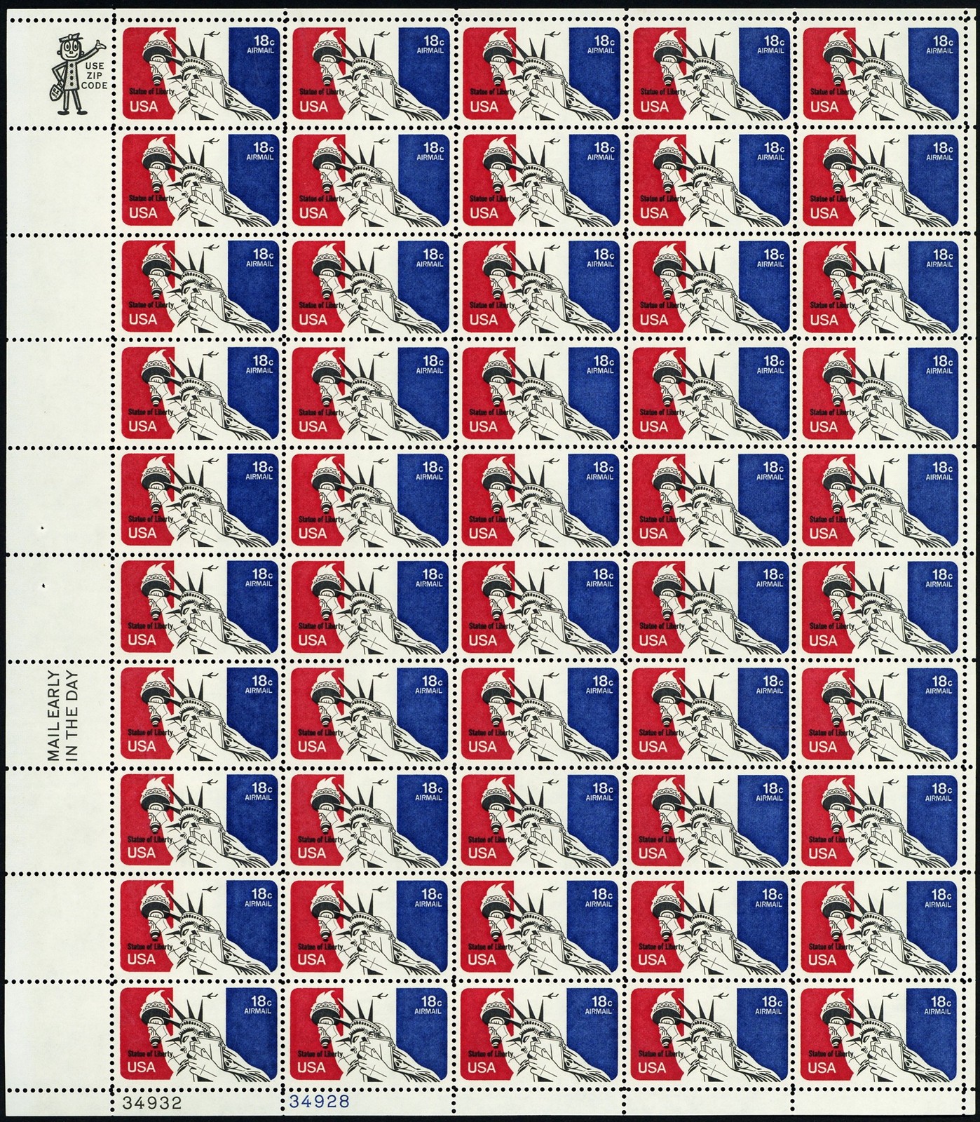 Statue of Liberty Full Sheet of Fifty 18 Cent Airmail Postage Stamps Scott C87