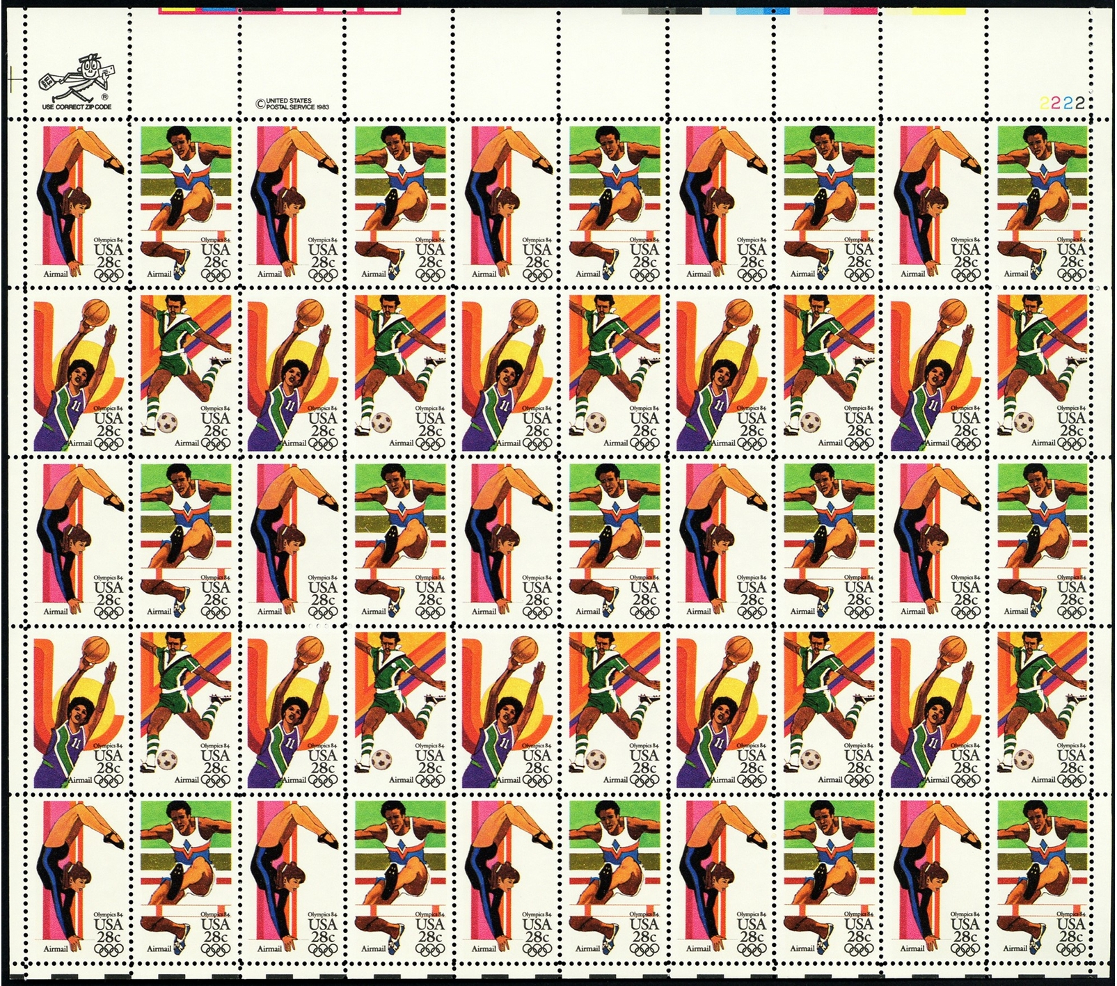 Summer Olympics 1984 Full Sheet of Fifty 28 Cent Airmail Stamps Scott C101-04