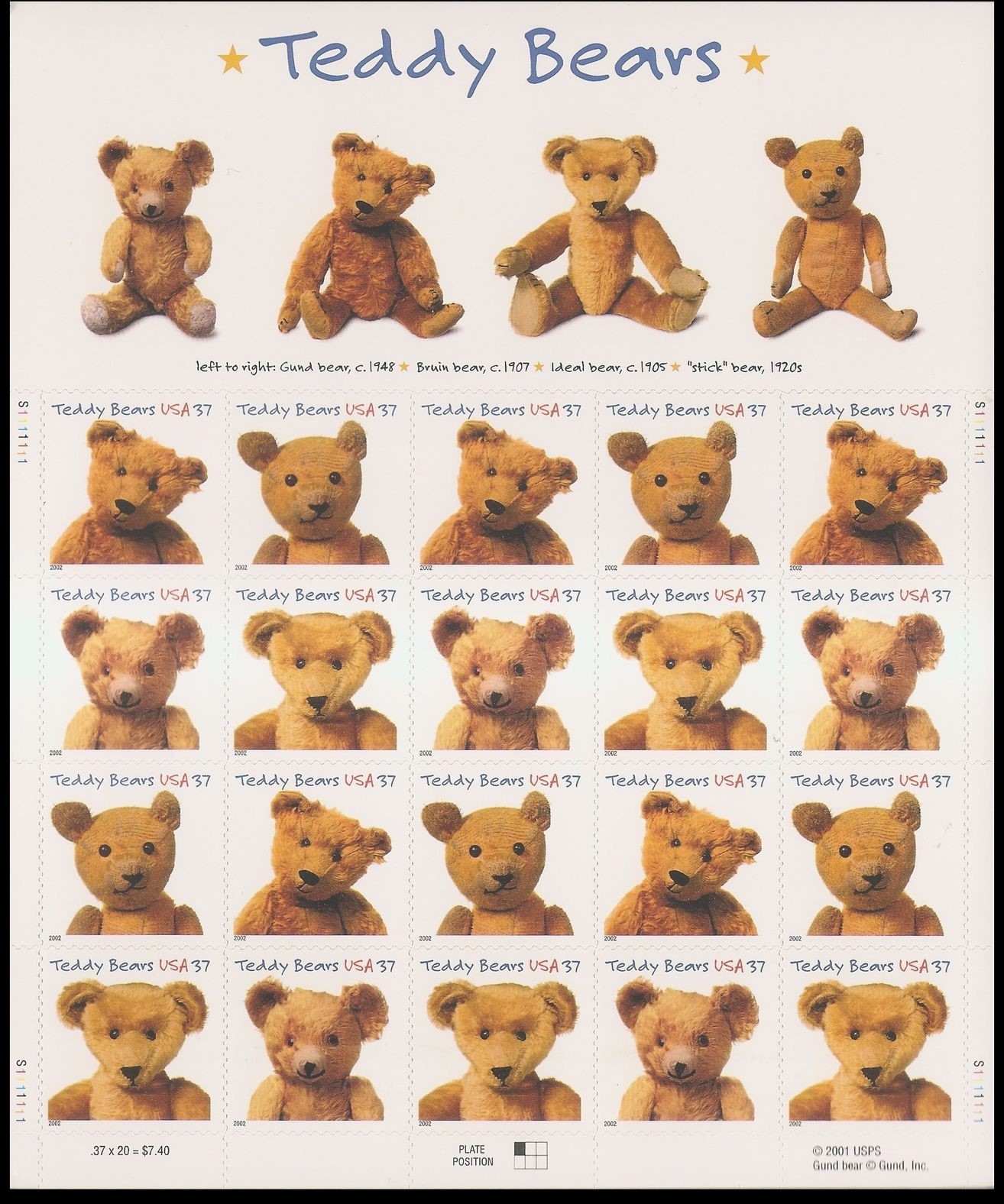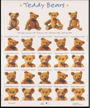 Teddy Bears Sheet of Twenty 37 Cent Stamps Scott 3653-56