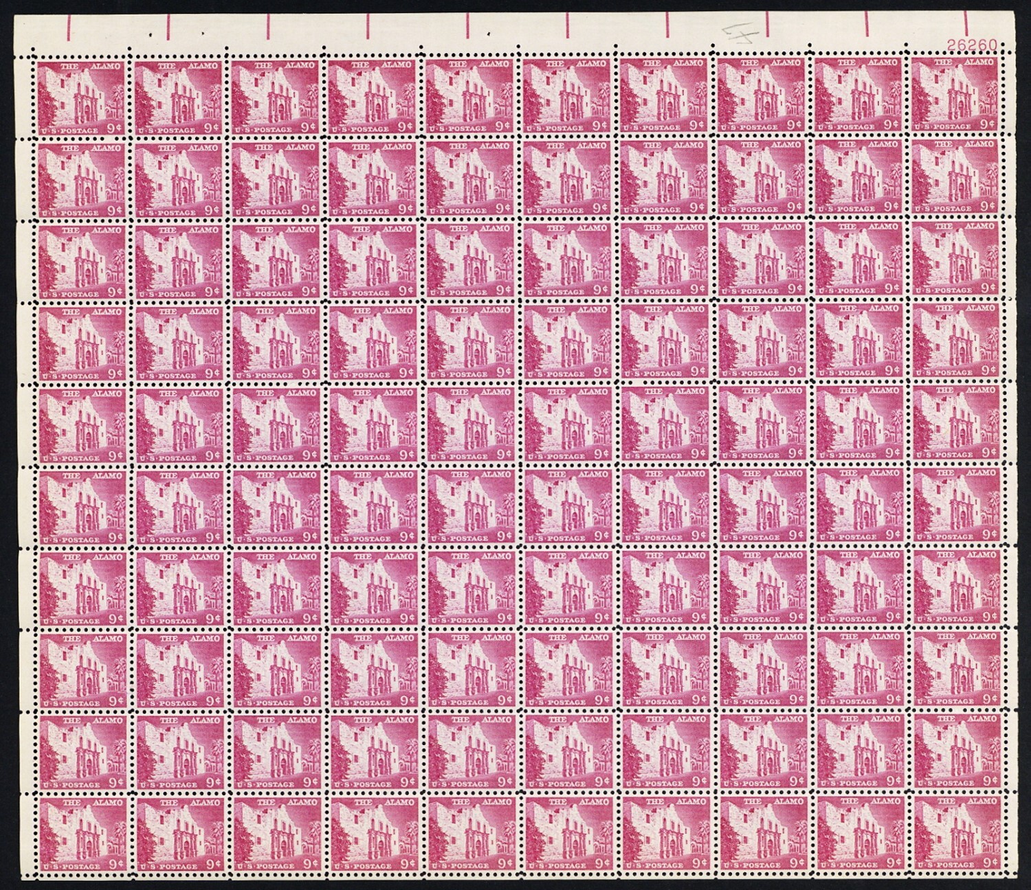 The Alamo 9¢ Complete Sheet of 100 Postage Stamps Scott 1043