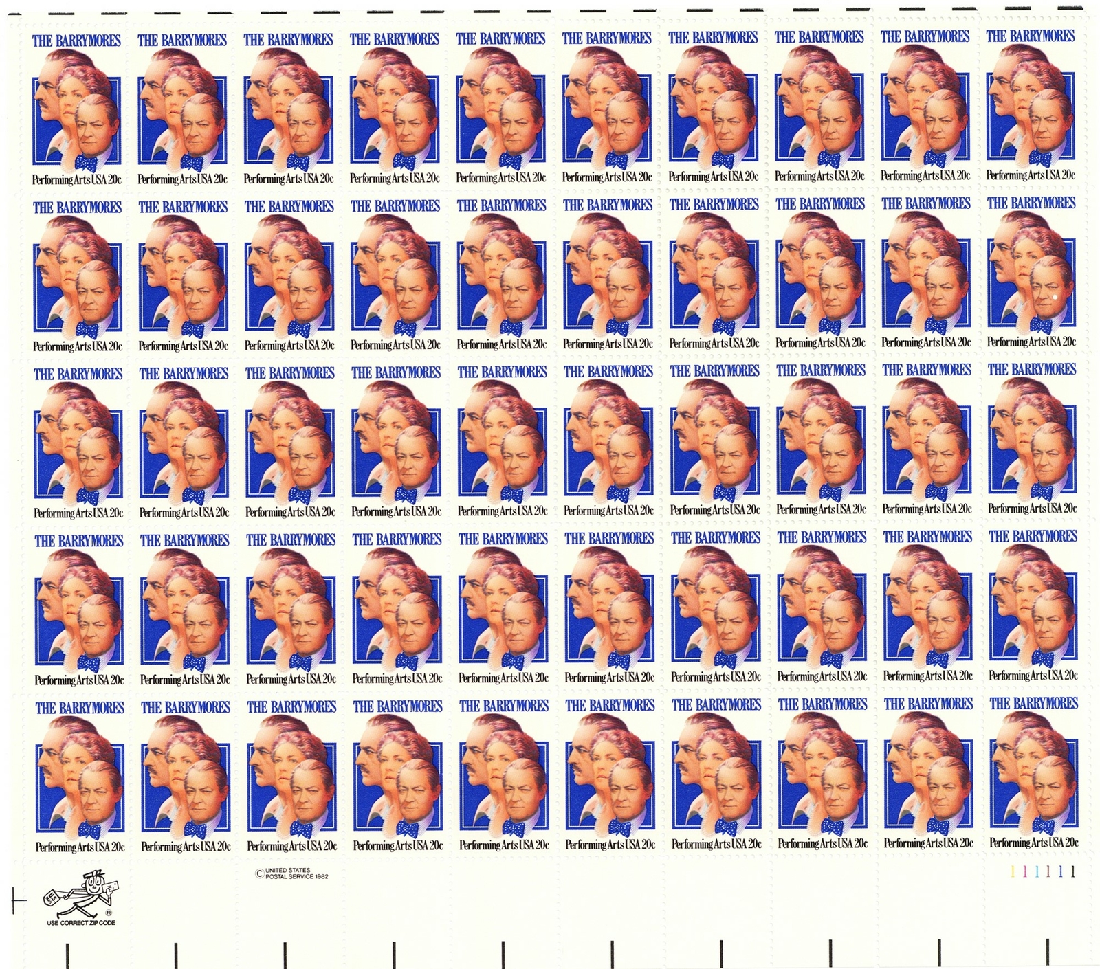 The Barrymores Actors Sheet of Fifty 20 Cent Postage Stamps Scott 2012