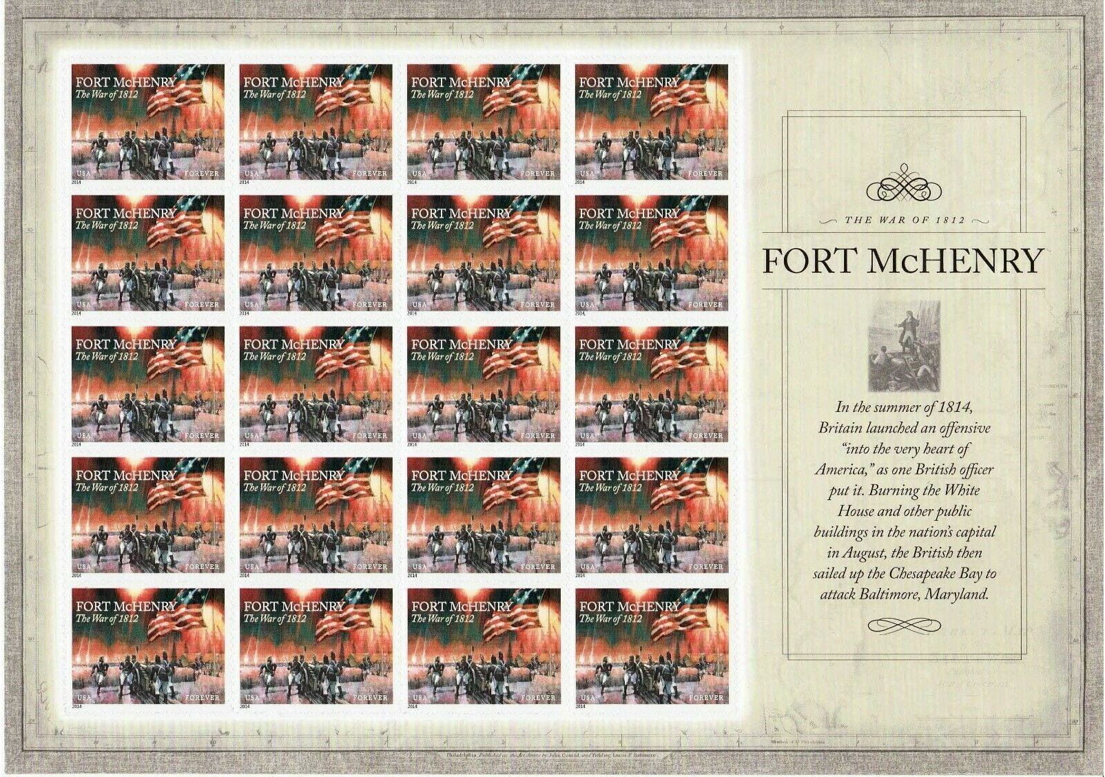 The War of 1812: Fort McHenry Sheet of 20 Current Rate Postage Stamps Scott 4921