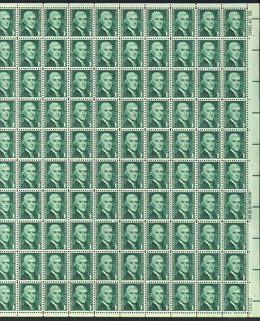 Thomas Jefferson Sheet of 100 - 1 Cent Postage Stamps Scott 1278
