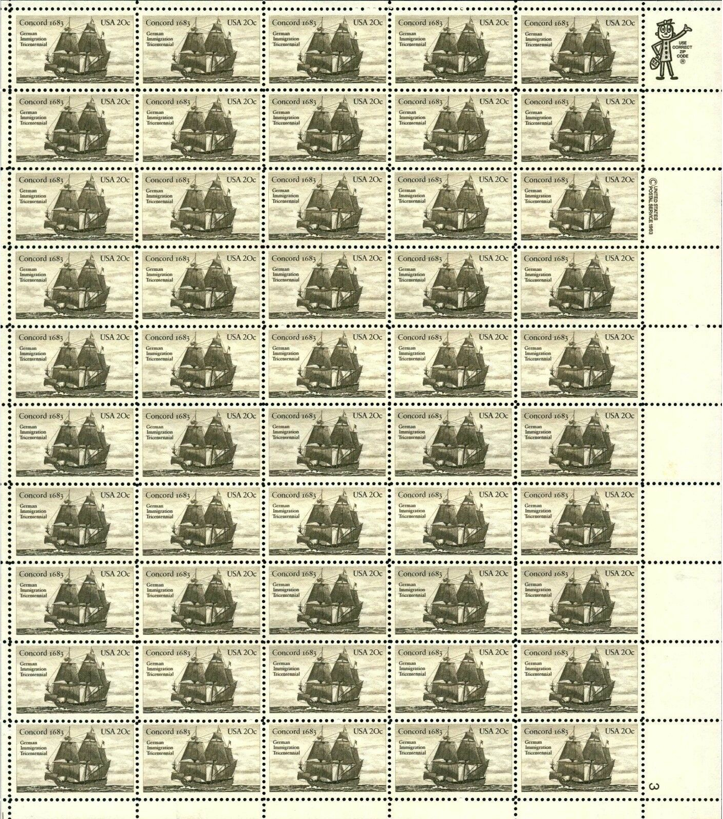 US - Germany Concord Ship Sheet of Fifty 20 Cent Postage Stamps Scott 2040