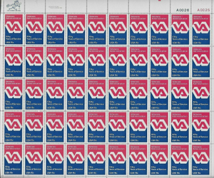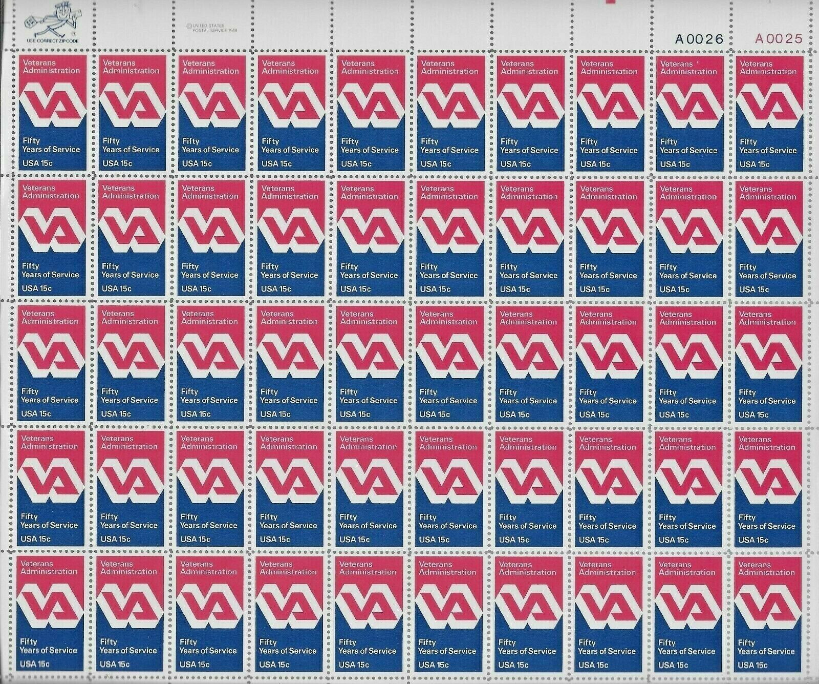 Veterans Administration Sheet of Fifty 15 Cent Postage Stamps Scott 1825