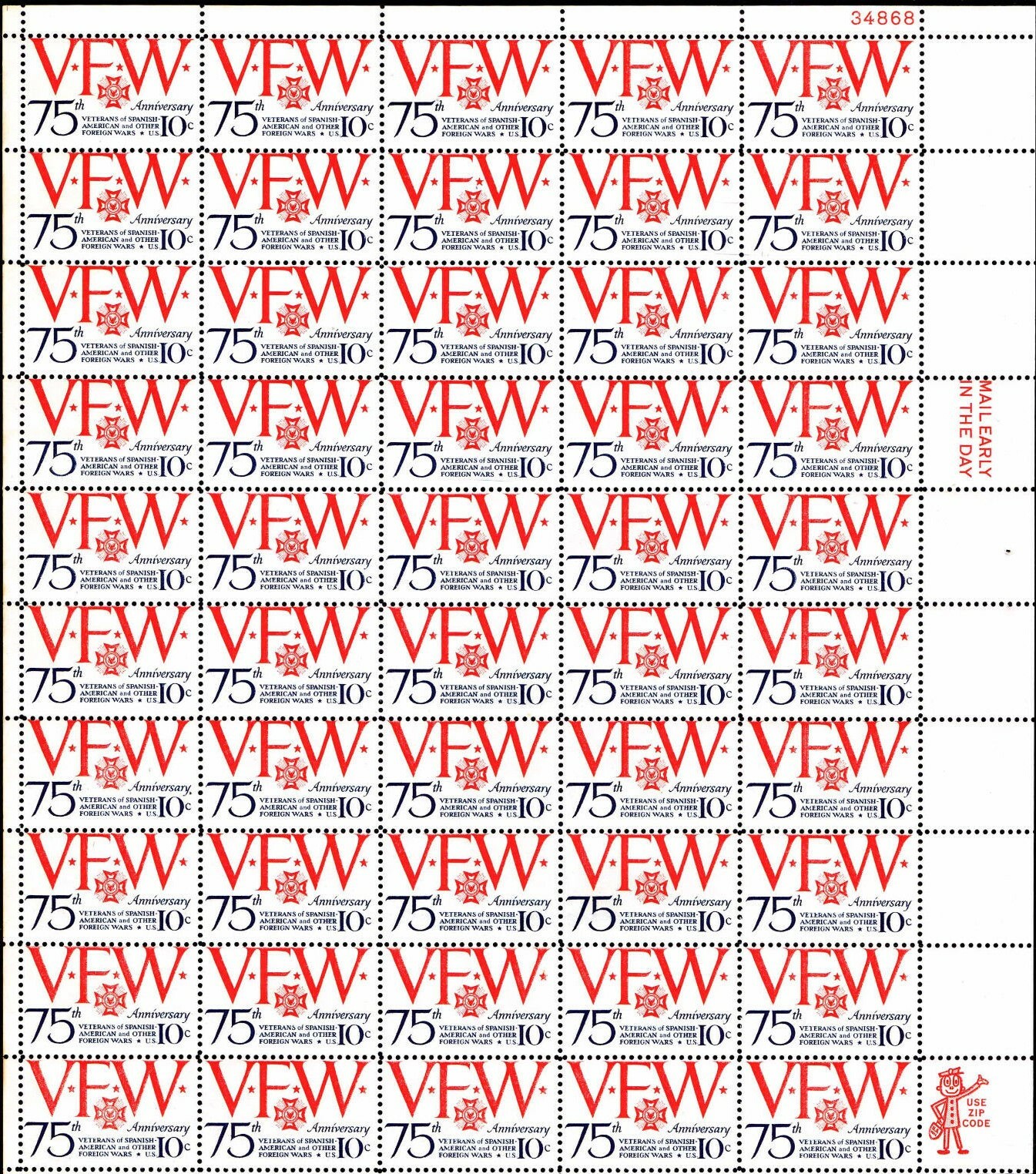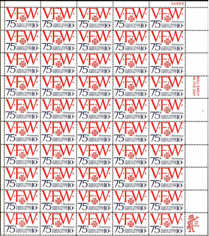 VFW 75th Anniversary Sheet of Fifty 3 Cent Postage Stamps Scott 1525