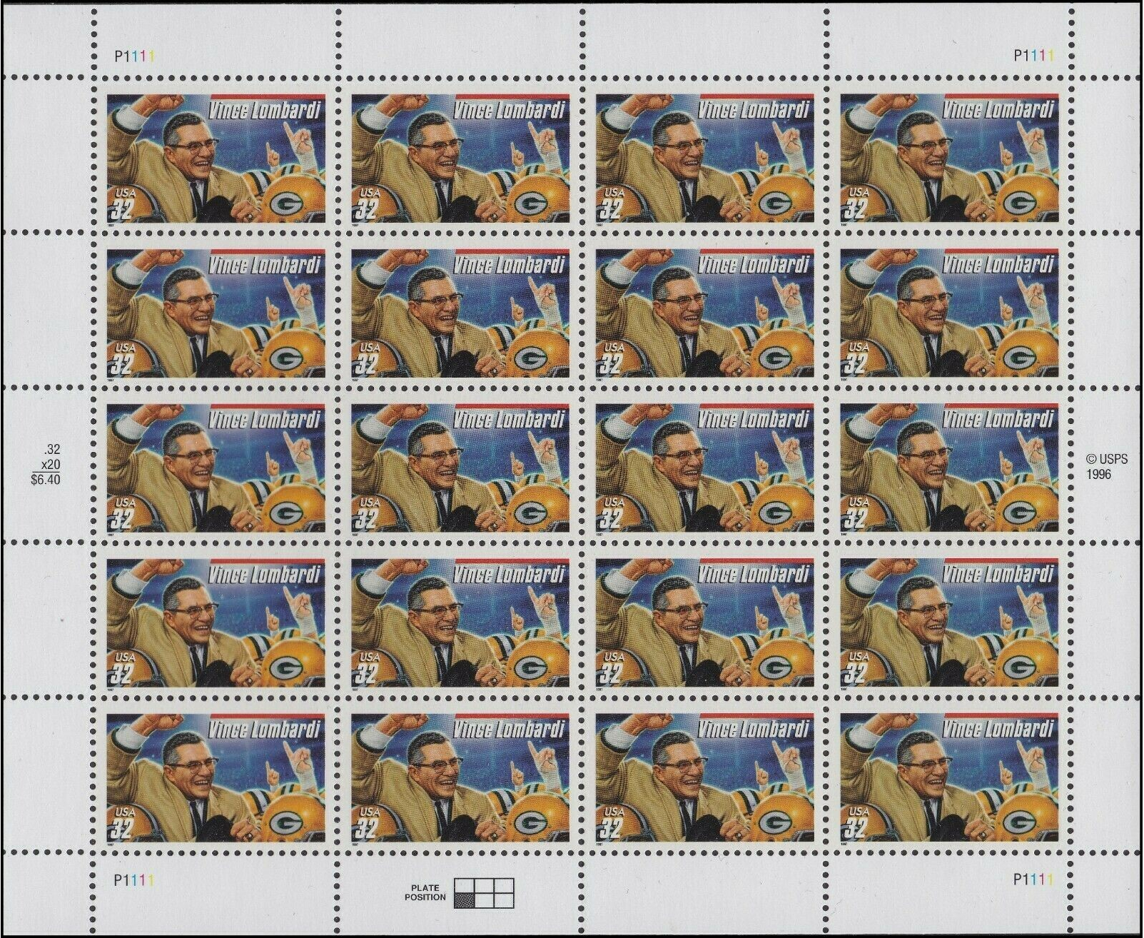 Vincent Lombardi Football Coach Sheet of Twenty 32 Cent Stamps Scott 3147