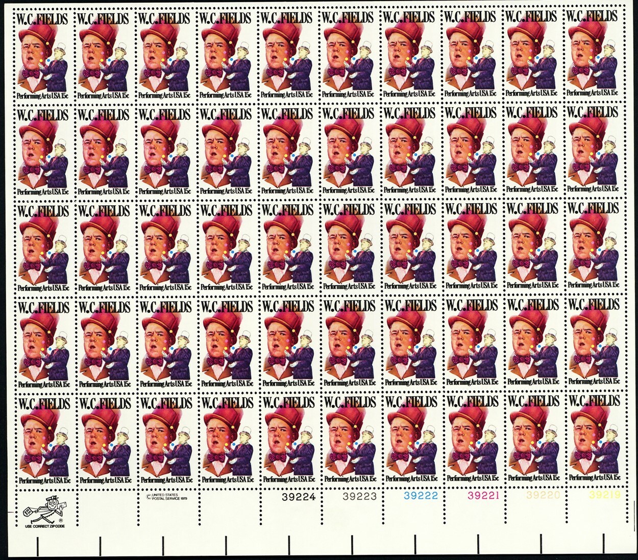 W.C. Fields Sheet of Fifty 15 Cent Postage Stamps Scott 1803