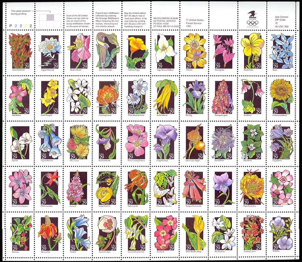 Wildflowers Full Sheet of Fifty 29 Cent Postage Stamps Scott 2647-96