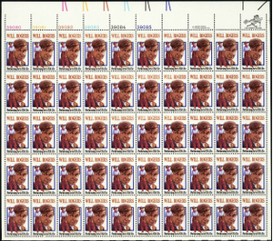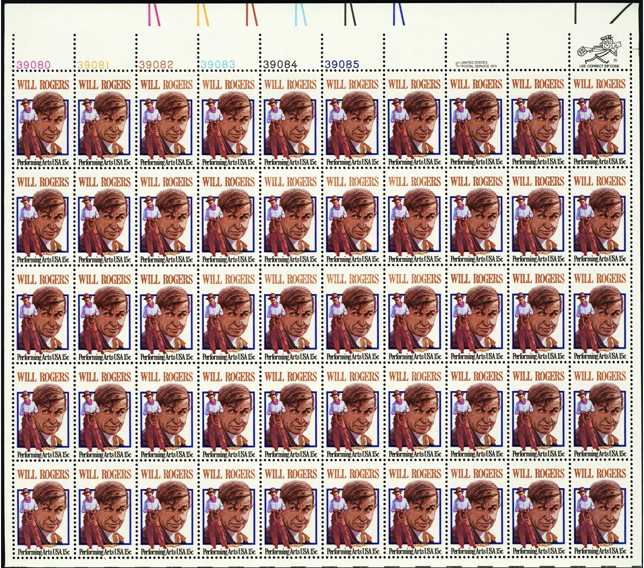 Will Rogers Sheet of Fifty 15 Cent Postage Stamps Scott 1801