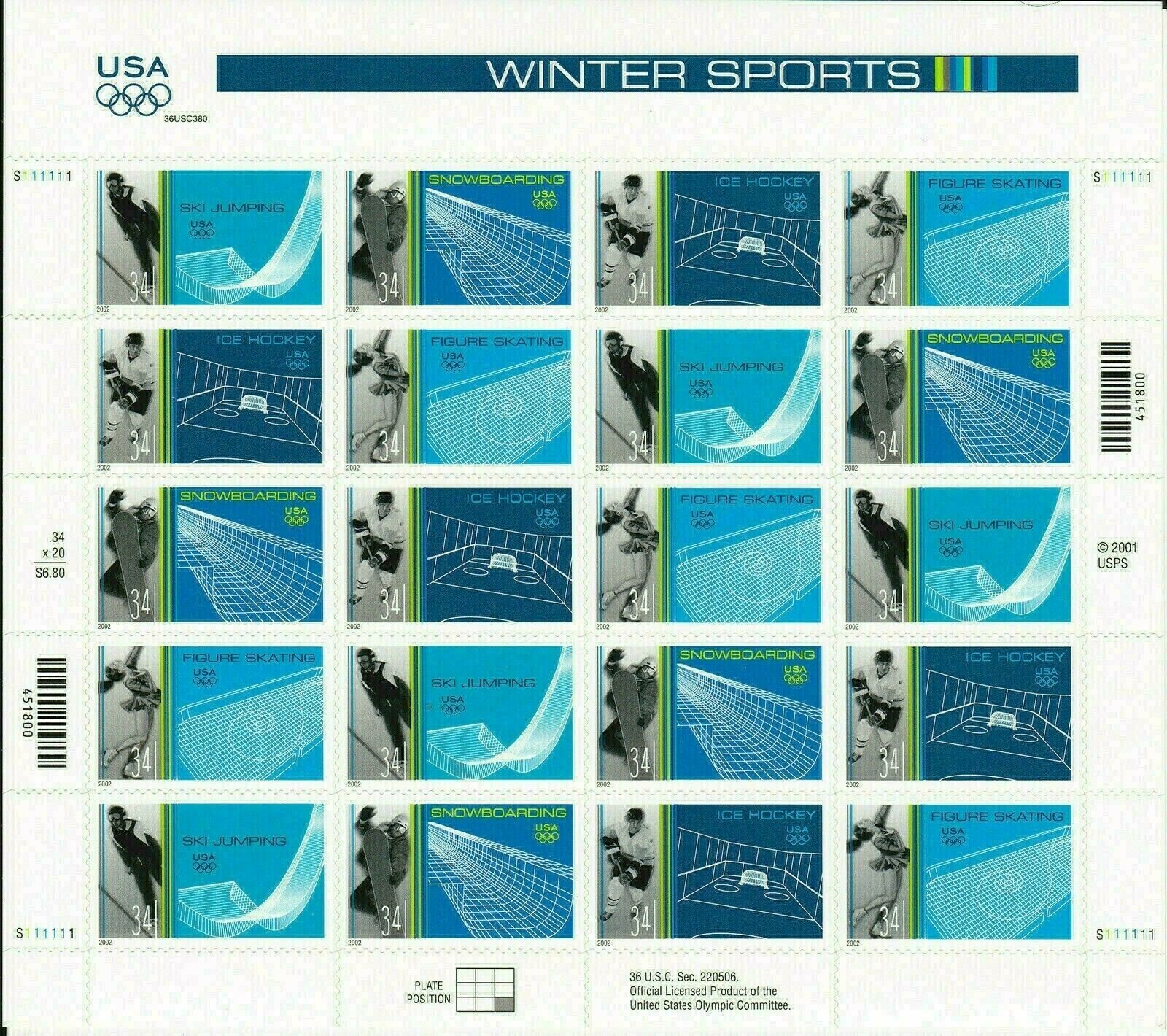 Winter Sports Sheet of Twenty 34 Cent Stamps Scott 3552-55