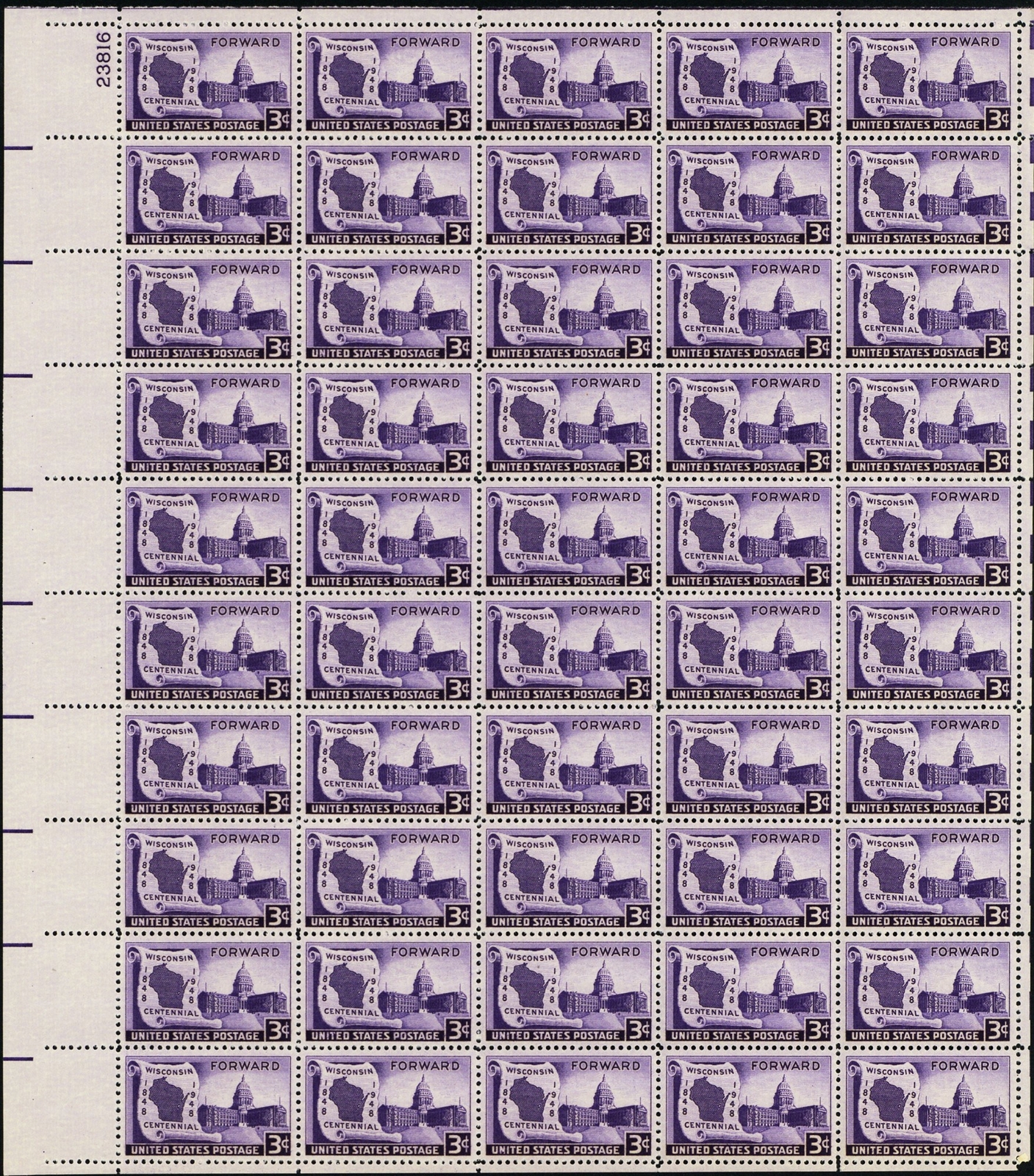 Wisconsin Centennial Sheet of Fifty 3 Cent Postage Stamps Scott 957