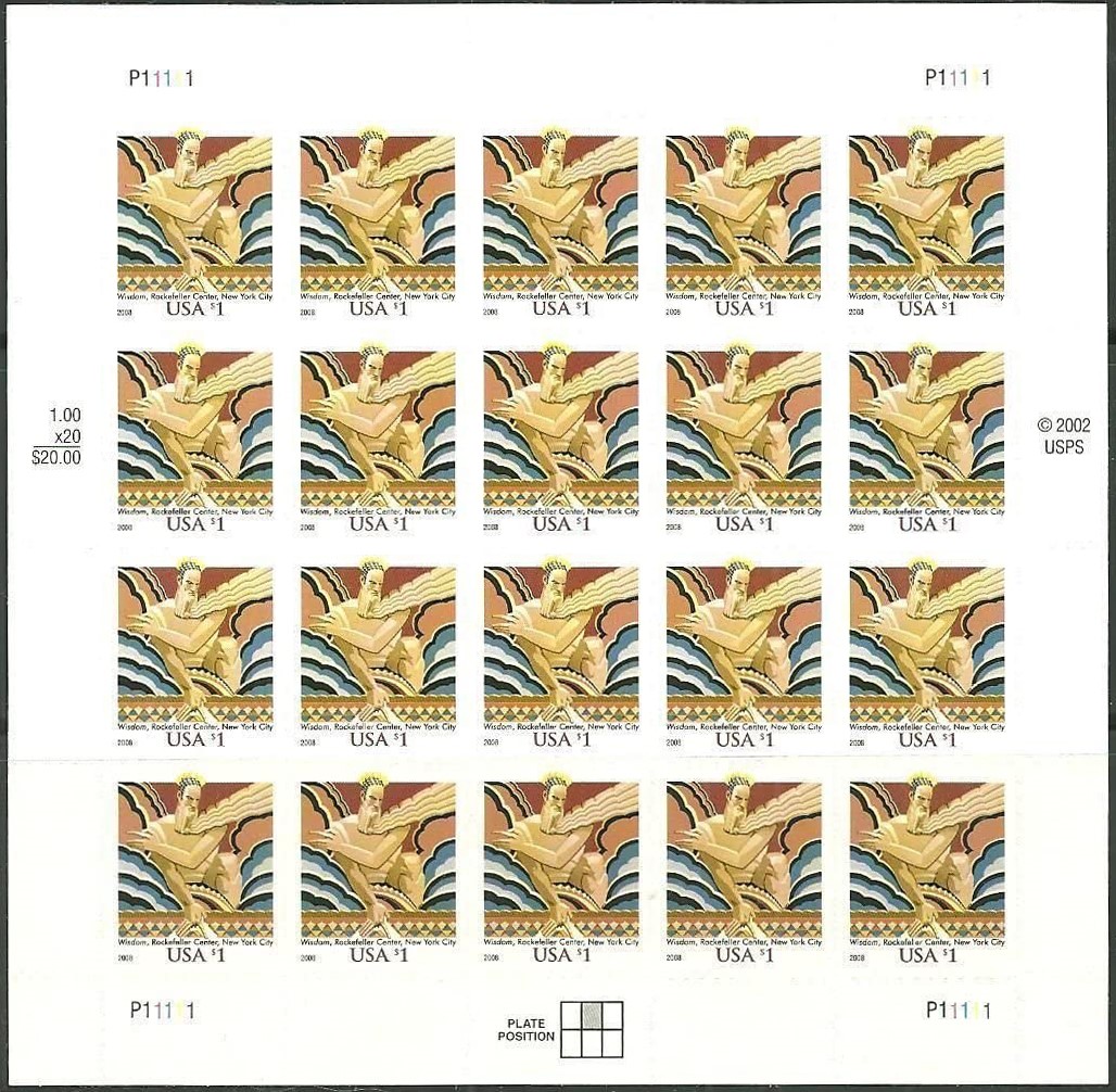 Wisdom Rockefeller Center Sheet of Twenty $1.00 Postage Stamps Scott 3766