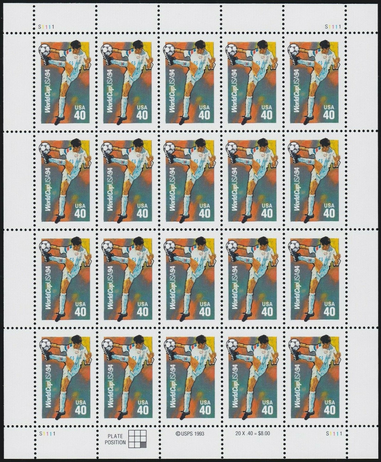 World Cup Soccer Sheet of Twenty 40 Cent Postage Stamps Scott 2835