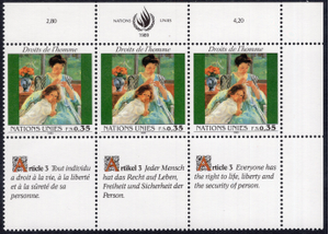 United Nations-Geneva Scott 180. Inscription block of 3. Mint. Never hinged.