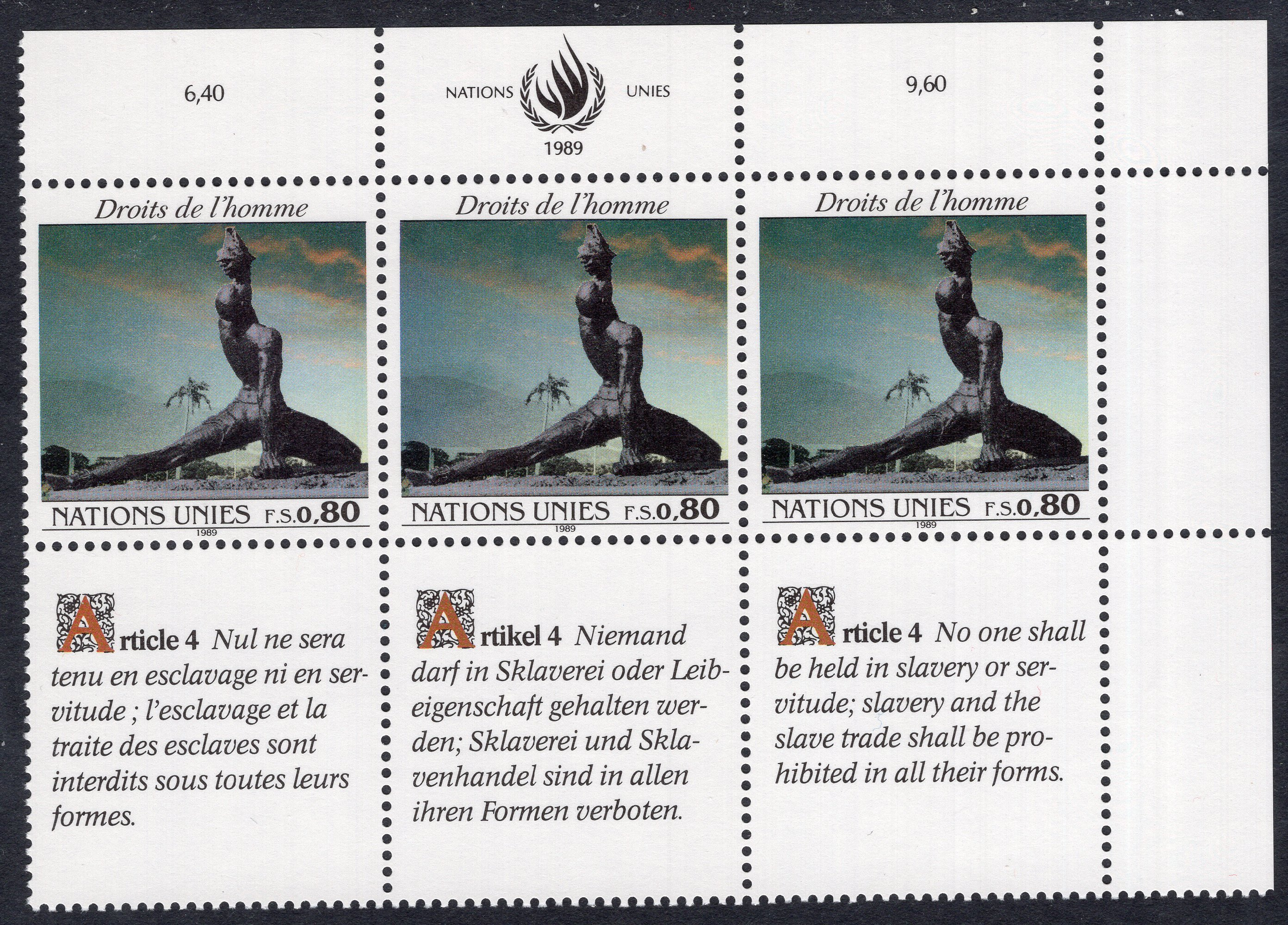 United Nations-Geneva Scott 181. Inscription block of 3. Mint. Never hinged.