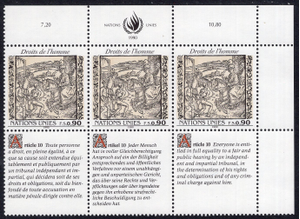 United Nations-Geneva Scott 194. Inscription block of 3. Mint. Never hinged.