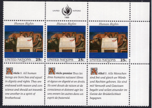 United Nations-New York Scott 570. Inscription block of 3. Mint. Never hinged.